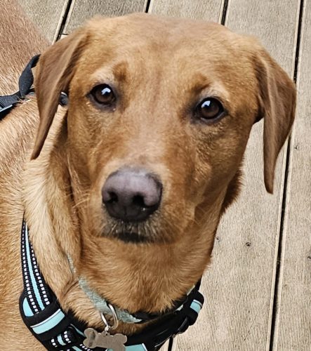 Ruby is a dark fox-red full British Lab female. She weighs around 53 pounds. Has a very calm disposition and loves to please. Retired 2014.